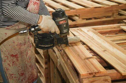 目前國內(nèi)木制托盤的材料主要有松雜木,松木,硬雜木,不同的材料代表托盤的不同使用性能。歐洲托盤標準中明確規(guī)定不能使用白楊木。木制托盤進行干燥定型處理,減少水分,消除內(nèi)應(yīng)力,然后進行切割、刨光、斷頭、抽邊、砂光等精整加工處理而形成型材板塊,采用具有防脫功能的射釘(個別情況采用螺母結(jié)構(gòu))將型材板塊裝訂成半成品托盤,進行精整,防滑處理處理。
